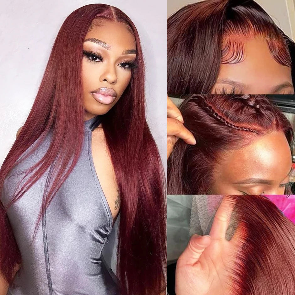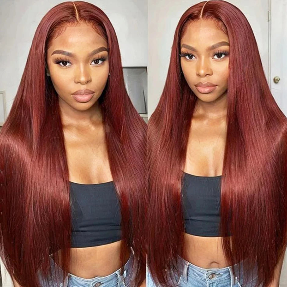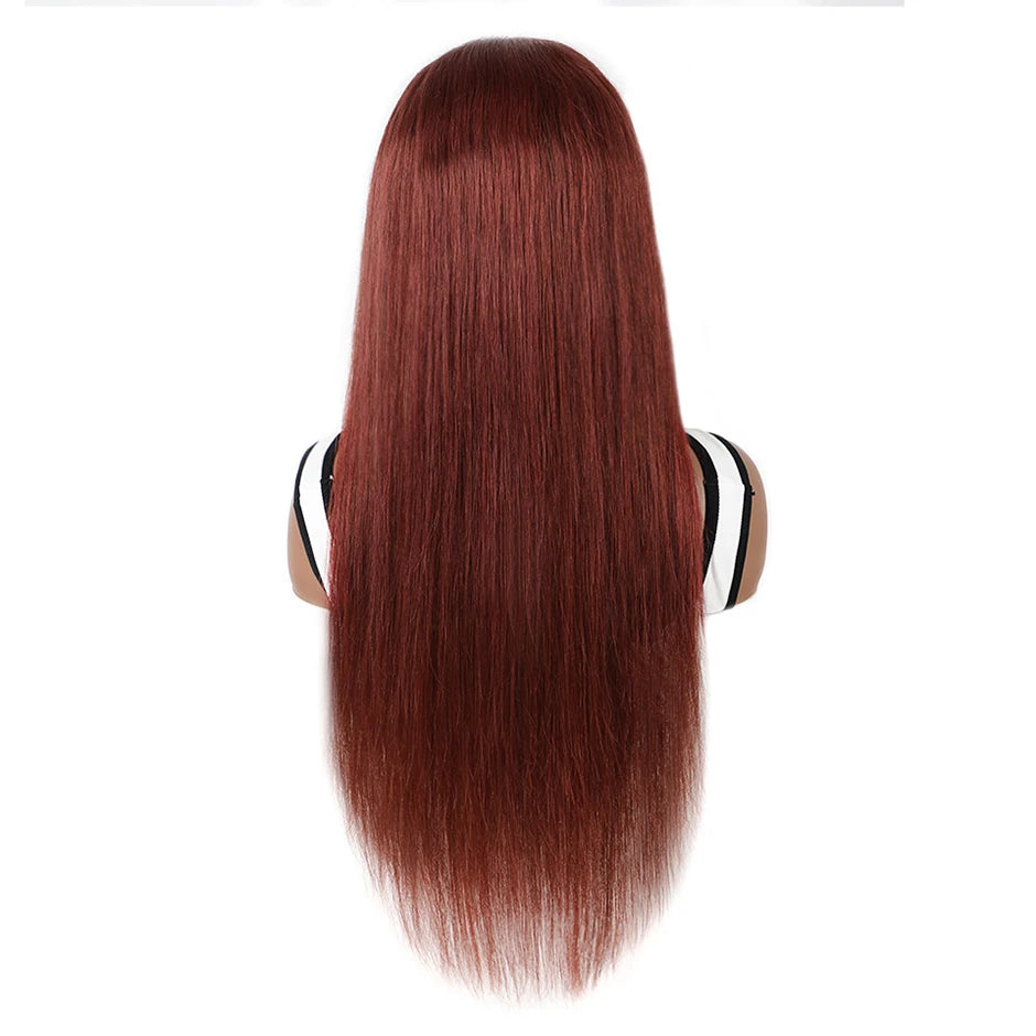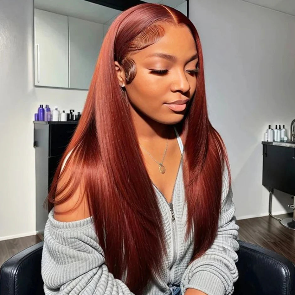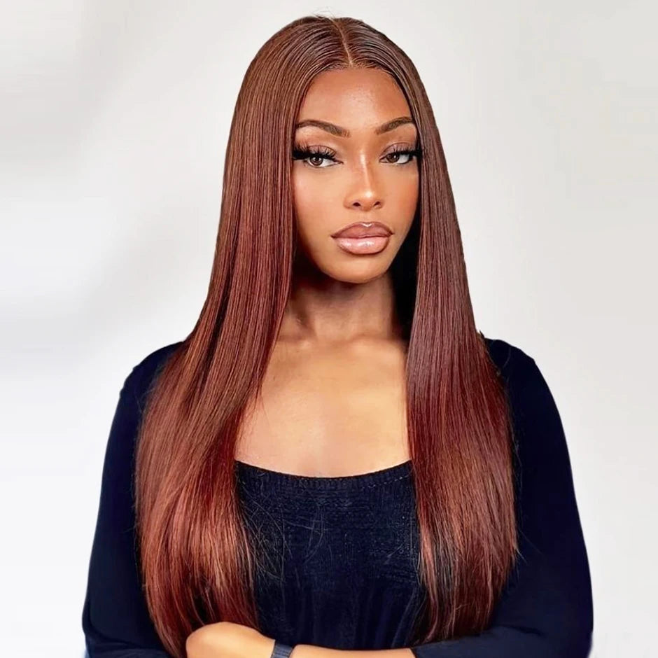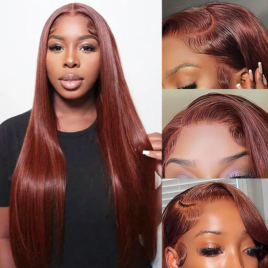 Perruque Brun roux n° 33, sans colle, 13x6, lisse, à lace frontale, pré-épilée, avec cordons invisibles, en cheveux humains.