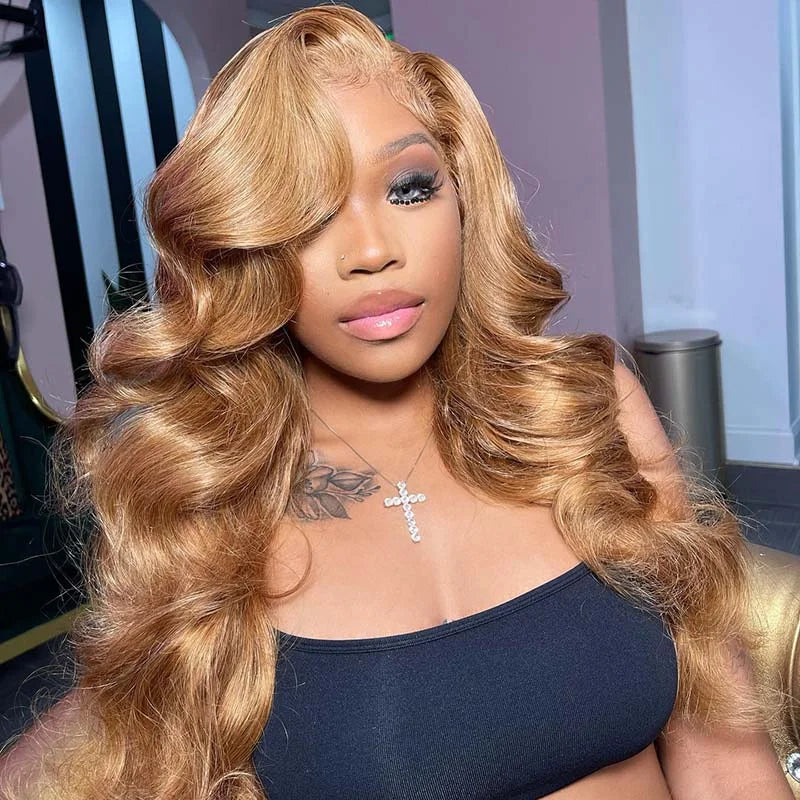Perruque Lace Front Blond Miel Wear And Go, Cheveux Humains Couleur #27, Ondulée, Pré-épilée, HD, Sans Colle, Prête à Porter